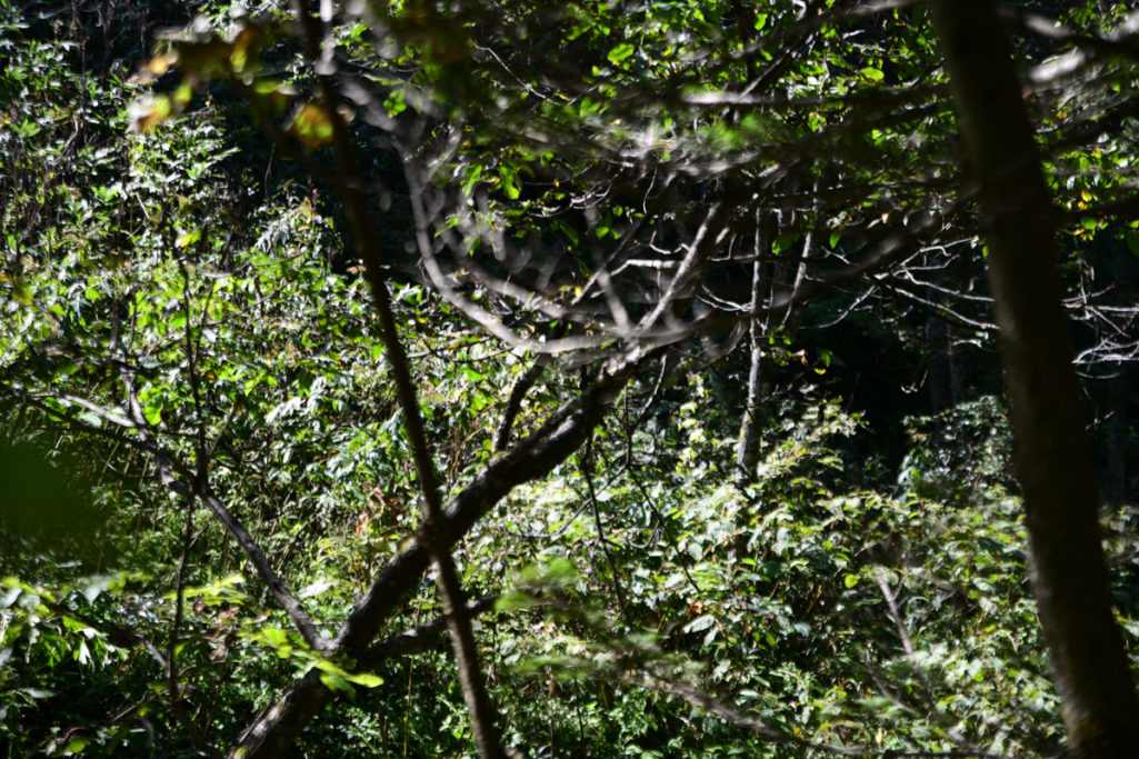 目を凝らして、音の主を探しますが、まったく姿が見えません。しかし藪が揺れている場所は確認できたので、こちらも温めたばかりのお茶を置いて、カメラを肩に掛け、ソッと近寄ってみます。小さな谷の向こう側なので、距離こそかなり近いですが、クマだとしても、最低限の安全圏は保っていると思っています(もちろんクマスプレーあり)。
